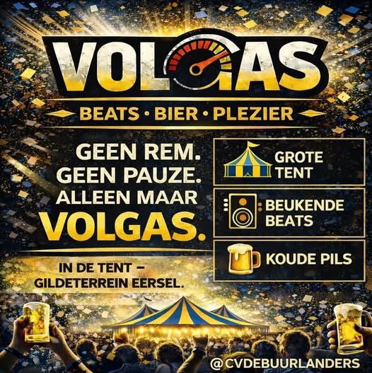 Reken op een vette beats, een dampende feesttent en ijskoude drankjes terwijl we samen aftellen naar carnaval. Geen opwarmertje, maar meteen VOLGAS vanaf de eerste minuut. Meer informatie over het exacte programma volgt binnenkort via de kanalen van CV De Buurlanders, maar vooral ook via de instagrampagina @volgas.eersel